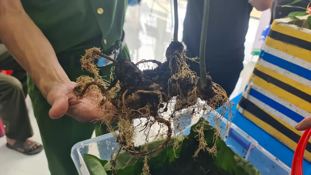 Sâm đưa đến hội thi được bao bọc kỹ lưỡng bằng lá môn để tránh bị hư hỏng, gãy cành. Ảnh: NGUYỄN CƯỜNG