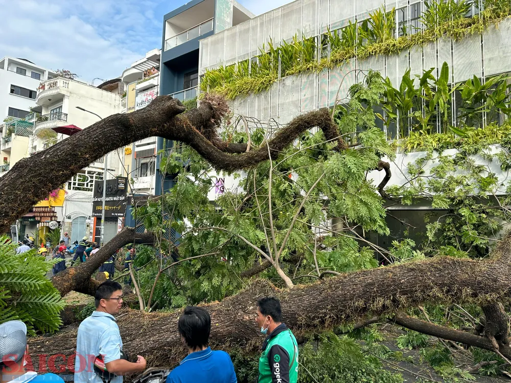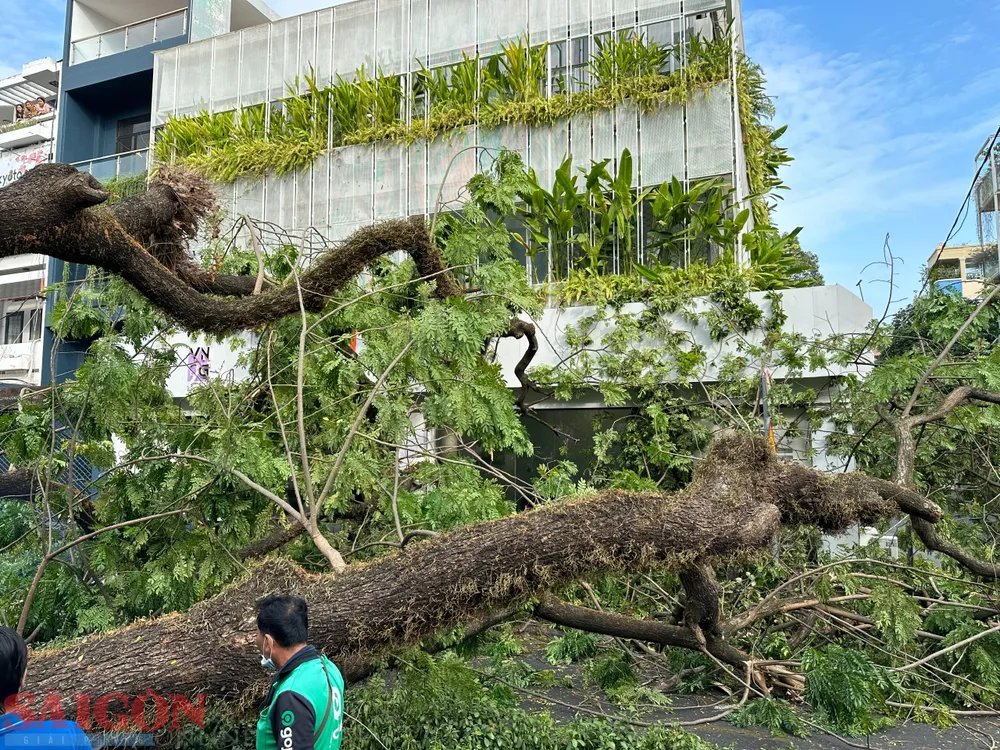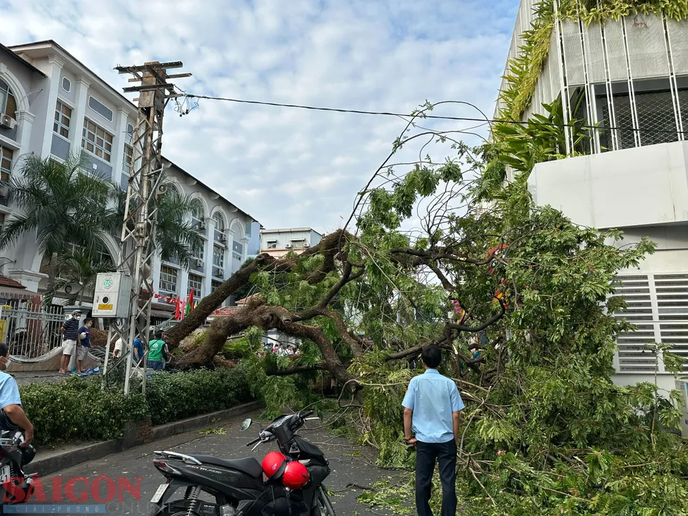Ghi nhận của phóng viên Báo SGGP, tại hiện trường, phần thân cây xanh đè hoàn toàn lên bức tường của trường và hết lòng lề đường Nguyễn Văn Thủ. Phần rễ cây trơ trụi, có dấu hiệu bị mục.