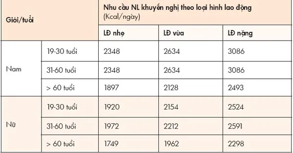 Bảng nhu cầu năng lượng theo khuyến nghị của Viện Dinh dưỡng năm 2012