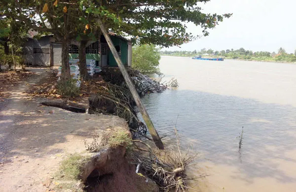 Nhà dân ở bờ Nam kênh Chợ Gạo (nằm trong vùng ảnh hưởng của dự án) bị sạt lở nghiêm trọng