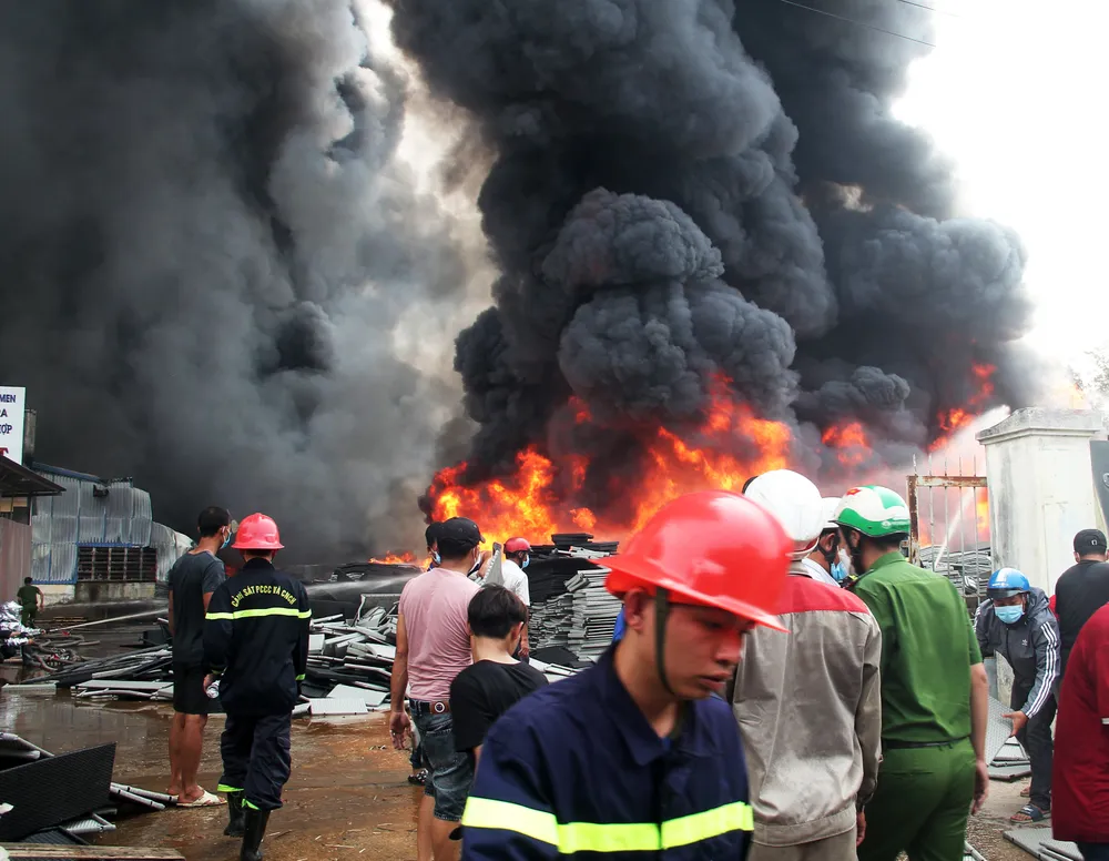Theo ghi nhận của PV Báo SGGP, thời điểm đám cháy bùng phát mạnh nhất khoảng 10 giờ, lửa lớn đang bao trùm cả khu xưởng, cột khói đen khổng lồ ngùn ngụt cao hàng trăm mét. Trong khu xưởng, lửa lớn kèm theo nhiều tiếng nổ như đạn pháo…