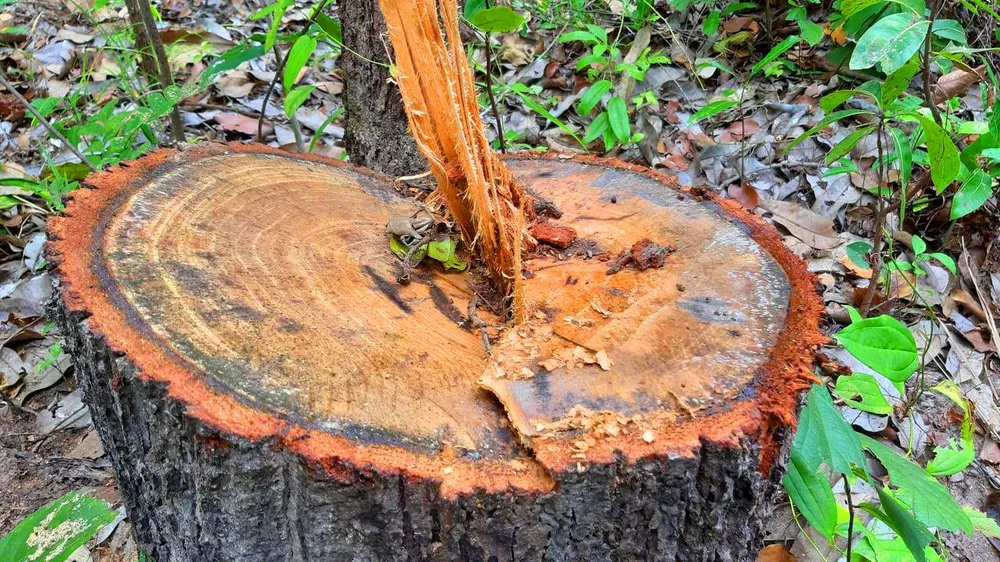 Phần thân đã được cưa lấy đi, chỉ còn gốc và ngọn