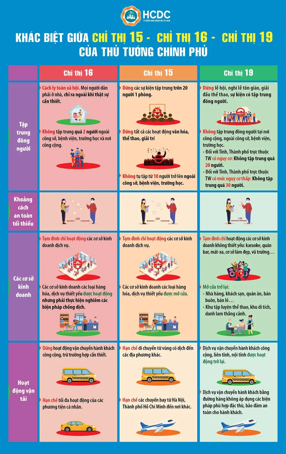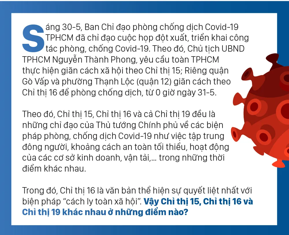 Sáng 30-5, Ban Chỉ đạo phòng chống dịch Covid-19 TPHCM đã chỉ đạo cuộc họp đột xuất, triển khai công tác phòng, chống Covid-19. Theo đó, Chủ tịch UBND TPHCM Nguyễn Thành Phong, yêu cầu toàn TPHCM thực hiện giãn cách xã hội theo Chỉ thị 15; Riêng quận Gò Vấp và phường Thạnh Lộc (quận 12) giãn cách theo Chỉ thị 16 để phòng chống dịch từ 0 giờ ngày 31-5. Vậy chỉ thị 15 và chỉ thị 16 khác nhau ở những điểm nào?