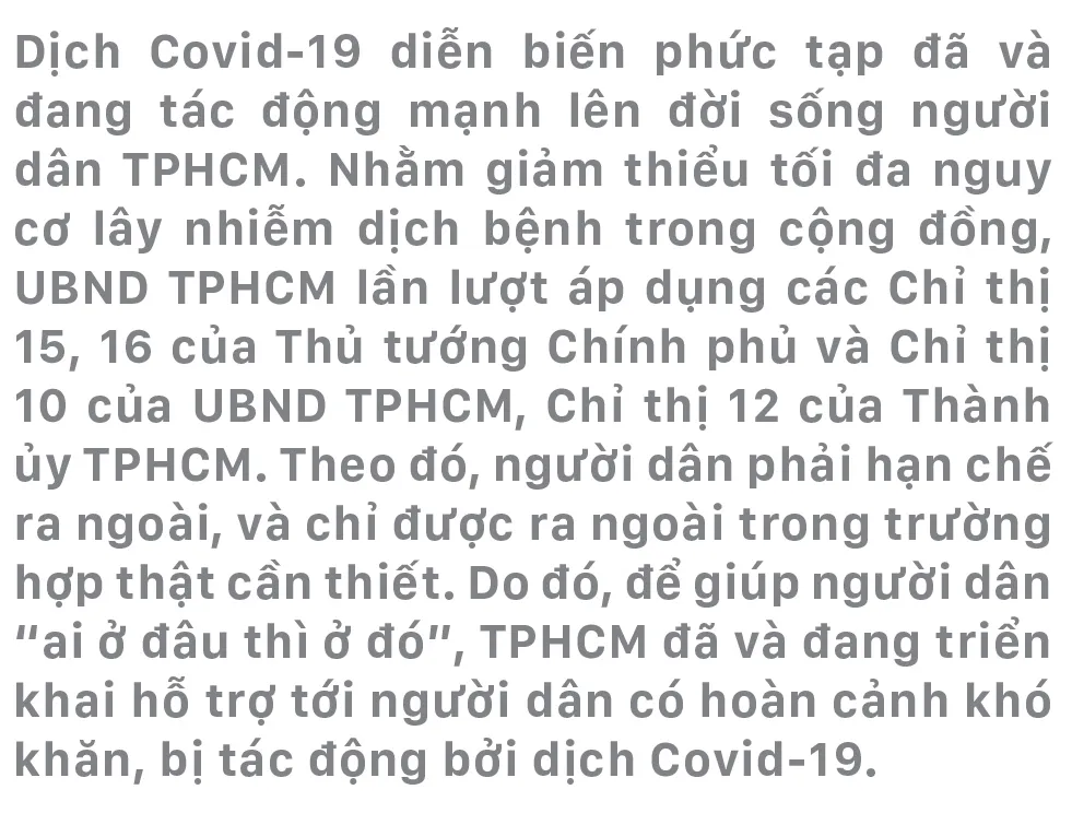 | Ngày 15-8, Thành trực Thành ủy TPHCM yêu cầu các quận, huyện và TP Thủ Đức khẩn trương rà soát các trường hợp khó khăn để nhận gói hỗ trợ an sinh xã hội trong tháng 8 và 9-2021.