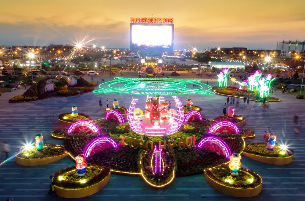 Ngay tại cổng chào với cụm tiểu cảnh “Lộc xuân” là những chú bướm to, cao 4 mét và đôi cánh màu sắc nổi bật, chào đón mọi người; cổng chính được trang trí đài lộc, đồng tiền lớn nhỏ bao quanh, cùng chú heo kim cương – linh vật chính của Tết Kỷ Hợi, mang đến nguồn tiền tài dồi dào về chất và lượng.