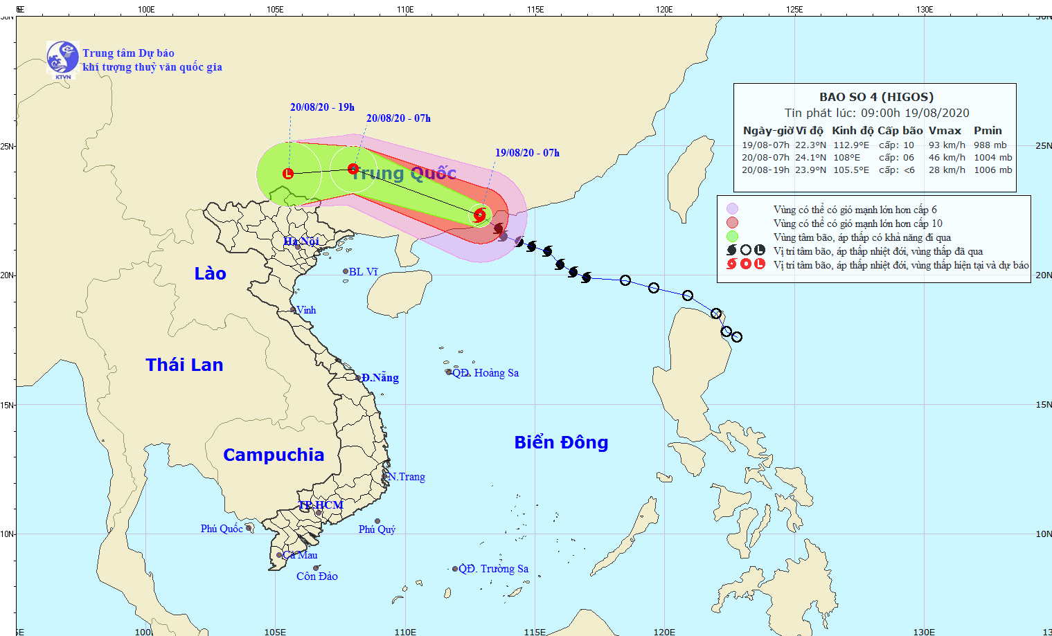 Đến sáng 20-8, vị trí tâm áp thấp nhiệt đới ở khoảng 24,1 độ Vĩ Bắc - 108 độ Kinh Đông, trên khu vực phía Tây Bắc tỉnh Quảng Tây (Trung Quốc). Sức gió mạnh nhất vùng gần tâm áp thấp nhiệt đới mạnh cấp 6 (40-50km/giờ), giật cấp 8.