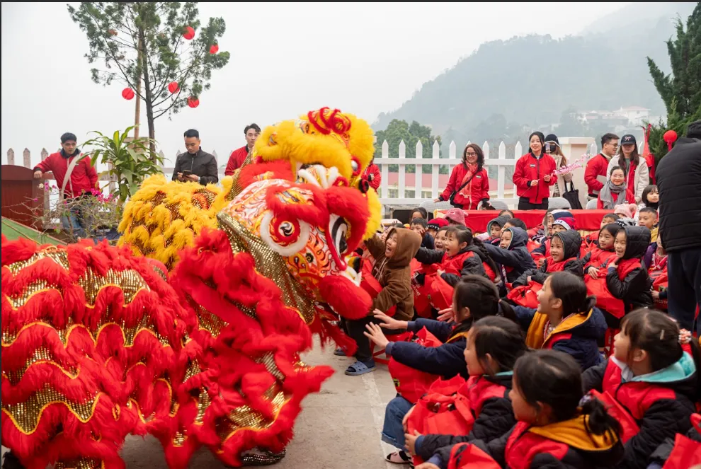 Không khí Tết ngập tràn sân trường như hội với hoa đào, câu đối, các tiết mục văn nghệ, múa lân, nhảy sạp, nhận quà, nhận lì xì, và đặc biệt hơn cả là hoạt động Chảo thịt kho tết khổng lồ thơm lừng, nóng hổi được thực hiện bởi các nghệ nhân, đầu bếp chuyên nghiệp.