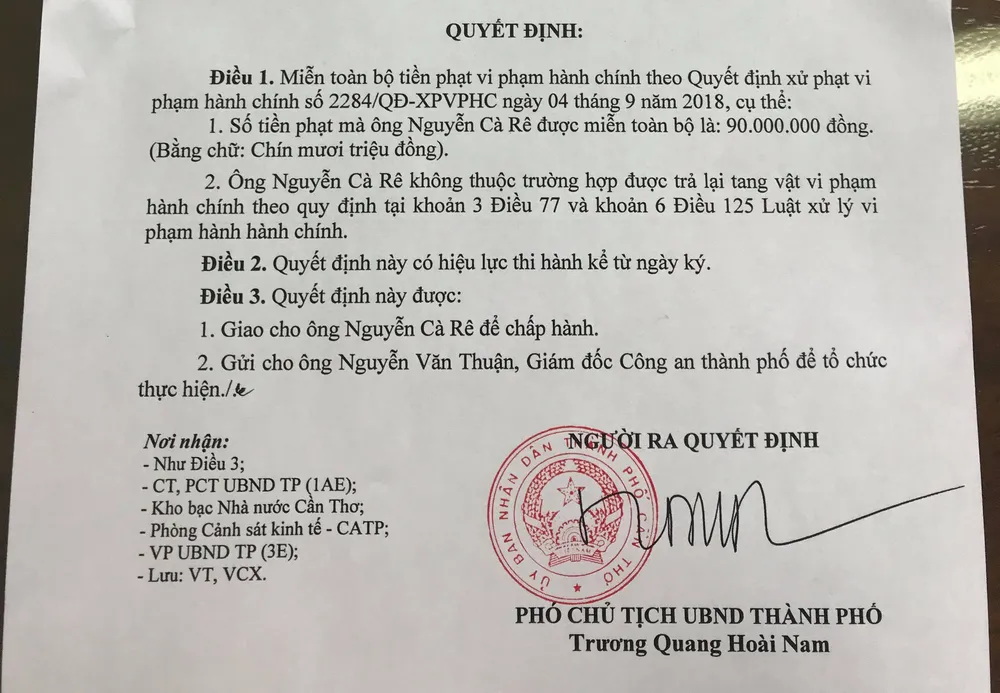 Theo đó, UBND TP Cần Thơ vừa ban hành Quyết định số 2875/QĐ-MTP (6-11-2018) về việc miễn toàn bộ tiền phạt vi phạm hành chính đối với ông Nguyễn Cà Rê (theo Quyết định 2284/QĐ-XPVPHC mà UBND thành phố đã ban hành ngày 4-9-2018, phạt 90 triệu đồng về hành vi “mua bán ngoại tệ tại tổ chức không được phép thu đổi ngoại tệ” đối với cá nhân ông Rê). Cả 2 quyết định trên do ông Trương Quang Hoài Nam, Phó Chủ tịch UBND TP Cần Thơ ký.