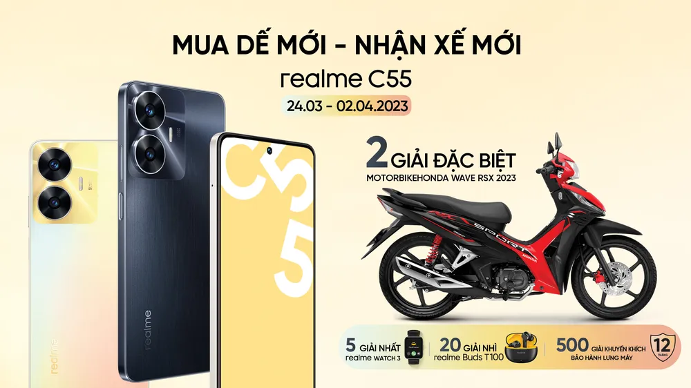 Ngày mở bán chính thức realme C55 thêm phần sôi động với chương trình quay số trúng thưởng “Mua dế mới - Nhận xế mới” bắt đầu từ 6 giờ ngày 24-3 đến 24 giờ ngày 2-4-2023. Bên cạnh giảm giá trực tiếp từ 4.990.000 đồng còn 4.790.000 đồng cho bản 6+128GB, và từ 5.990.000 đồng còn 5.690.000 đồng cho bản 8+256GB, ưu đãi trả góp 0% và bảo hành 18 tháng, khách hàng còn có cơ hội trúng nhiều quà tặng với tổng giá trị lên đến 150 triệu đồng khi tham gia chương trình này. Đặc biệt, người mua sẽ có cơ hội trúng thưởng xe máy Honda Wave RSX 2023 và hàng loạt quà công nghệ hấp dẫn khác.