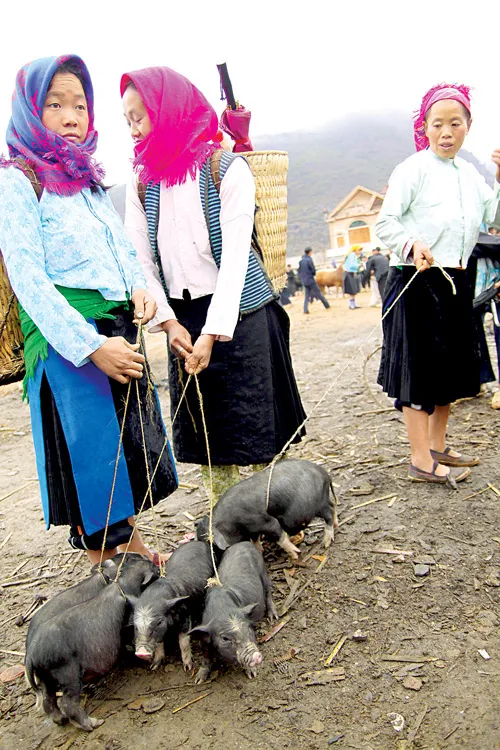 Phụ nữ tụ lại một góc chợ bán những chú heo mọi.