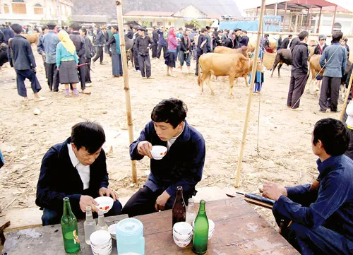 Gần trưa, chợ đã vãn, người mua kẻ bán hàn huyên trong những quán rượu nhỏ cạnh chợ.