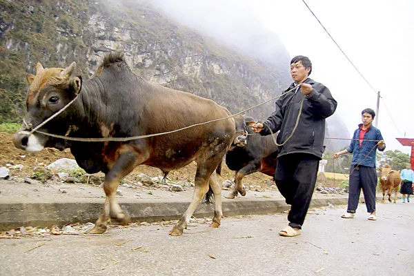 Bà con những bản xa cả chục cây số dắt bò xuống chợ.