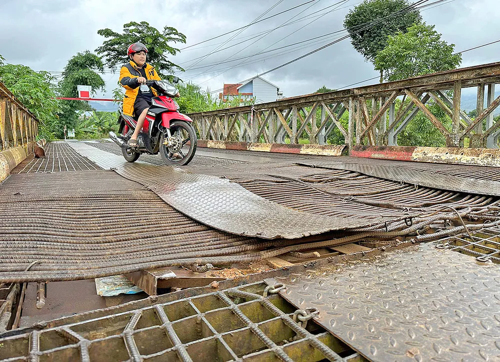 Cầu sắt Đông Thanh dài khoảng 40m nối các xã Đông Thanh, Mê Linh ra thị trấn Nam Ban (huyện Lâm Hà), đi TP Đà Lạt (Lâm Đồng) từ lâu bị xuống cấp nặng. Tại đây, bề mặt cầu đã xuất hiện tình trạng nhiều thanh sắt, tấm thép lớn bị tách ra khỏi khung cầu chĩa lên trời, gây nguy hiểm cho người và phương tiện qua lại (ảnh).