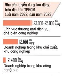Ông Nguyễn Văn Lâm cho biết thêm, bên cạnh các doanh nghiệp gặp khó khăn phải cắt giảm lao động, giai đoạn cuối năm 2022, đầu năm 2023 vẫn còn nhiều doanh nghiệp có nhu cầu tuyển dụng lao động với số lượng rất lớn. Để đáp ứng nhu cầu của các doanh nghiệp cũng như hỗ trợ tìm việc làm cho người lao động mất việc, Sở LĐTB-XH phối hợp với Liên đoàn Lao động (LĐLĐ) TPHCM và các đơn vị liên quan tổ chức các sàn giao dịch, giới thiệu việc làm. Tuy nhiên, thời điểm cuối năm, tâm lý không ít lao động mất việc không muốn tìm việc chính thức mà chọn làm thời vụ và hưởng trợ cấp thất nghiệp, hưởng BHXH một lần để về quê, sau tết mới trở lại thành phố tìm việc làm mới.