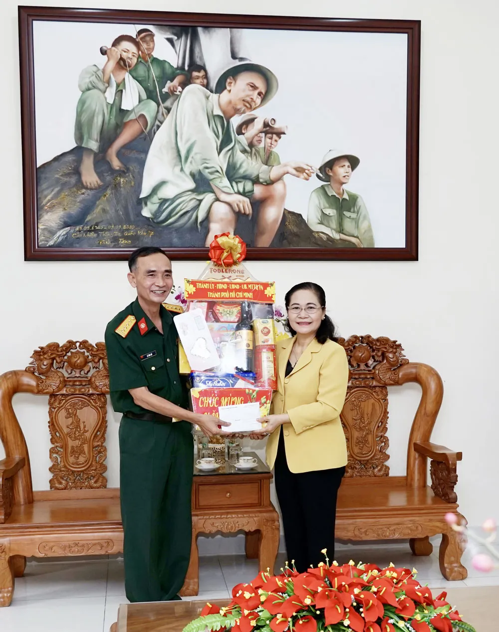 Chủ tịch HĐND TPHCM Nguyễn Thị Lệ tặng quà Lữ đoàn Thông tin 23 - Quân khu 7. Ảnh: HOÀNG HÙNG