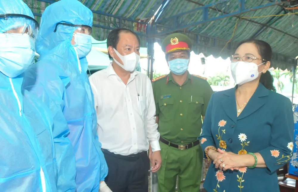 Tại các chốt, Chủ tịch HĐND TPHCM Nguyễn Thị Lệ đã thăm hỏi đời sống, sinh hoạt và biểu dương sự nỗ lực của các cán bộ, chiến sĩ, nhân viên y tế ngày đêm bám chốt làm nhiệm vụ.