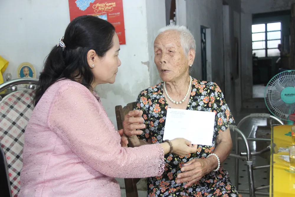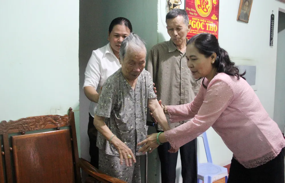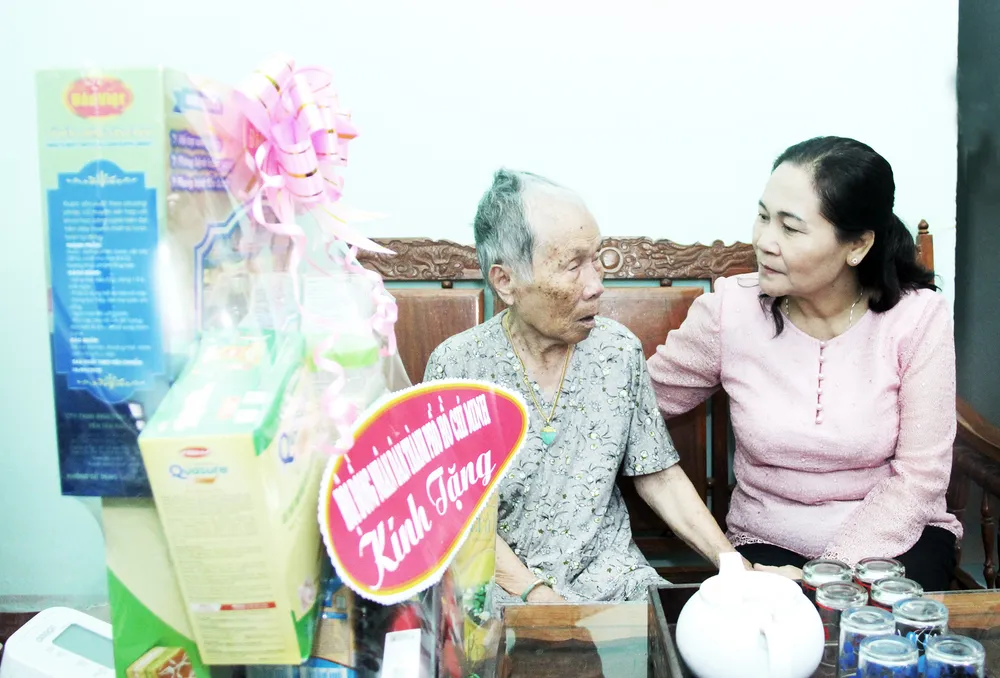 Tại nhà bà Hồ Thị Tám (97 tuổi, thương binh), đồng chí Nguyễn Thị Lệ ân cần thăm hỏi, động viên và chia sẻ trước những khó khăn của gia đình.