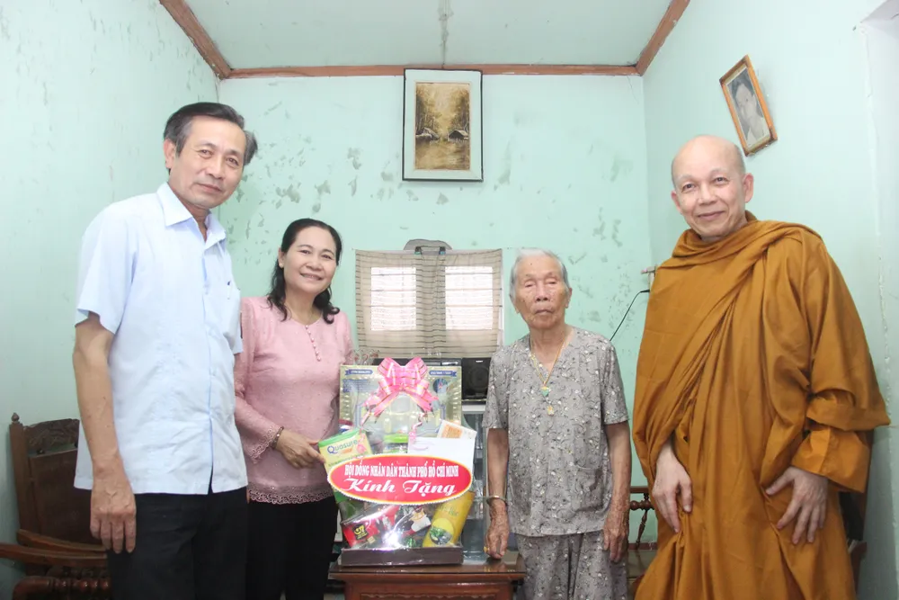 Đồng chí Nguyễn Thị Lệ cùng đoàn công tác trao quà của HĐND TPHCM cho chiến sĩ cách mạng Trần Bình Trọng