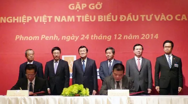 Chủ tịch nước Trương Tấn Sang chứng kiến lễ ký kết Biên bản ghi nhớ về hợp tác giữa Đại sứ quán Việt Nam tại Campuchia và Hiệp hội các nhà đầu tư Việt Nam sang Campuchia (AVIC).