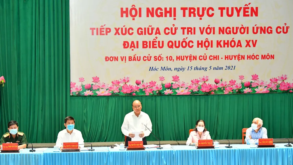 Chiều 14-5, Chủ tịch nước Nguyễn Xuân Phúc cùng các ứng cử viên đại biểu Quốc hội (ĐBQH) khóa XV, đơn vị bầu cử số 10 tiếp xúc trực tuyến với hơn 1.000 cử tri ở 12 xã, thị trấn thuộc huyện Hóc Môn (TPHCM).