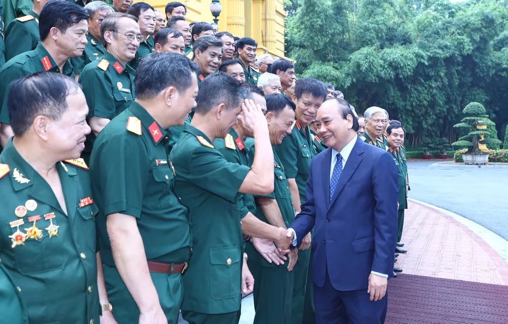 Chủ tịch nước Nguyễn Xuân Phúc với các đại biểu Ban liên lạc Hội Cựu chiến binh toàn quốc mặt trận Vị Xuyên - Hà Tuyên