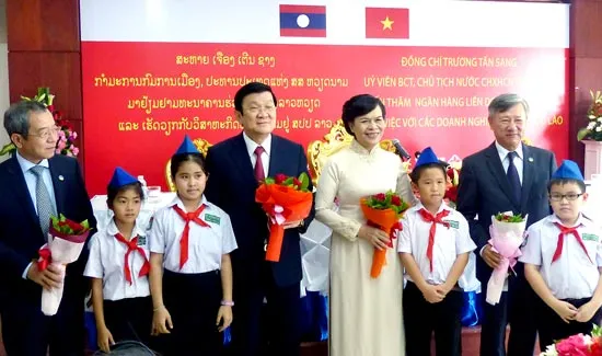 Đến thăm Ngân hàng liên doanh Lào - Việt và trò chuyện với cộng đồng doanh nghiệp Việt Nam đầu tư tại Lào, Chủ tịch nước Trương Tấn Sang đã biểu dương những kết quả đầu tư của cộng đồng doanh nghiệp Việt Nam tại Lào. Hiện nay, Việt Nam có 413 dự án với tổng vốn đăng ký khoảng 5 tỷ USD, là nhà đầu tư lớn thứ 2 tại Lào. Chủ tịch nước Trương Tấn Sang cho rằng, trong quá khứ cũng như hiện nay, Đảng, Nhà nước và nhân dân Lào đã giúp đỡ, hy sinh cho Việt Nam rất nhiều, nhất là trong 2 cuộc kháng chiến đấu tranh giành độc lập dân tộc. Vì vậy, giờ đây, khi Việt Nam có điều kiện phát triển kinh tế hơn Lào, chúng ta đầu tư, giúp bạn phát triển kinh tế - xã hội là lẽ đương nhiên. Đầu tư, kinh doanh là phải có lãi, nhưng với Lào, các doanh nghiệp Việt Nam cần phải biết cân đối hài hòa lợi ích, đặt lợi ích của các bạn Lào lên trước. Lào phát triển, ổn định thì Việt Nam cũng vui mừng và phát triển.