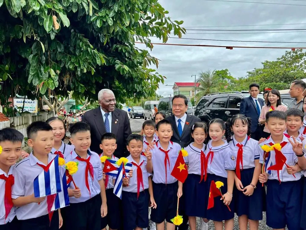 Chủ tịch Quốc hội Cuba Esteban Lazo Hernandez và Phó Chủ tịch Thường trực Quốc hội Trần Thanh Mẫn nói chuyện và chụp ảnh với thiếu nhi tỉnh Quảng Trị |