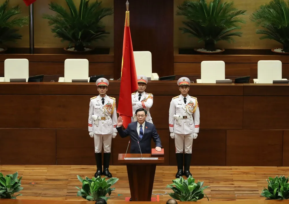 “Dưới cờ đỏ sao vàng thiêng liêng của Tổ quốc, trước Quốc hội và đồng bào cử tri cả nước, tôi – Chủ tịch Quốc hội nước CHXHCN Việt Nam xin tuyên thệ: Tuyệt đối trung thành với Tổ quốc, với Nhân dân, với Hiến pháp nước CHXHCN Việt Nam; nỗ lực hoàn thành tốt nhiệm vụ mà Đảng, Nhà nước và Nhân dân giao phó” – Chủ tịch Quốc hội khóa XV Vương Đình Huệ tuyên thệ.