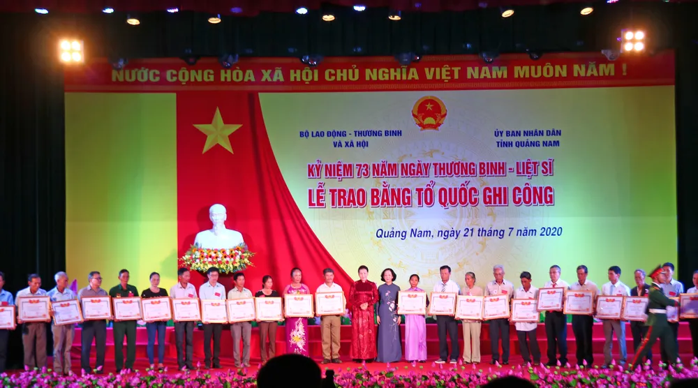 Sáng 21-7, tại tỉnh Quảng Nam, Bộ LĐ-TB-XH và UBND tỉnh Quảng Nam phối hợp tổ chức Lễ trao Bằng Tổ quốc ghi công tới 73 thân nhân gia đình liệt sĩ, đại diện cho 580 Bằng Tổ quốc ghi công được trao nhân dịp 27-7-2020.