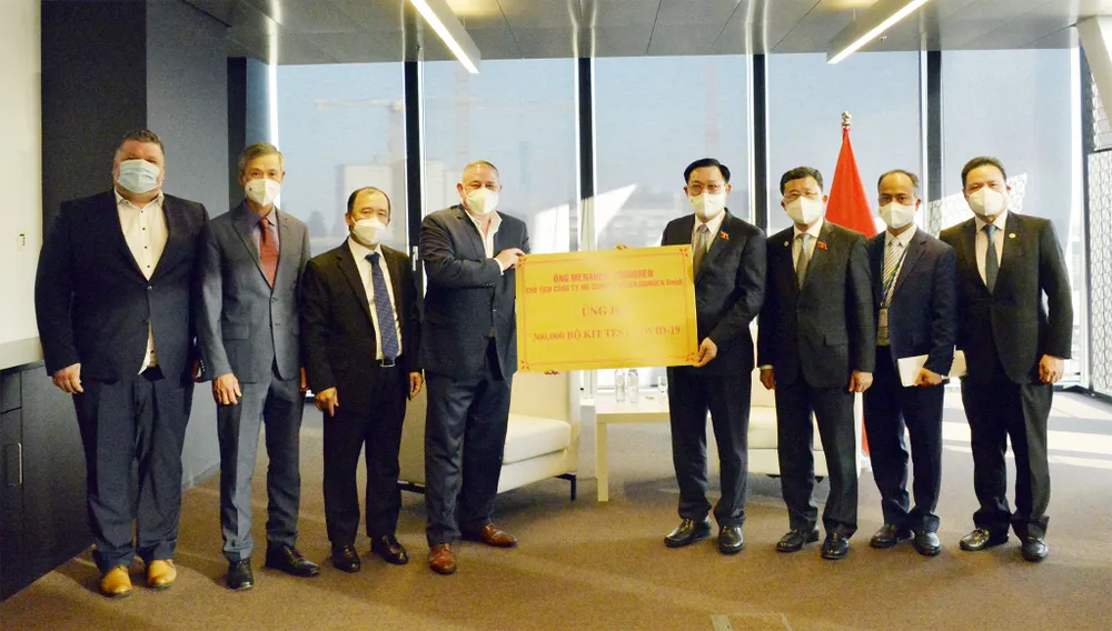 Tối qua, 6-9, theo giờ địa phương, tại Thủ đô Vienna, Áo, trong cuộc gặp với Chủ tịch Quốc hội Vương Đình Huệ, Tập đoàn WEFORYOU đã trao tặng Việt Nam 30 nghìn khẩu trang y tế N95, 10.000 bộ kit xét nghiệm kháng nguyên và 10 máy lấy mẫu xét nghiệm PCR (mỗi máy giá trị 20.000 USD).