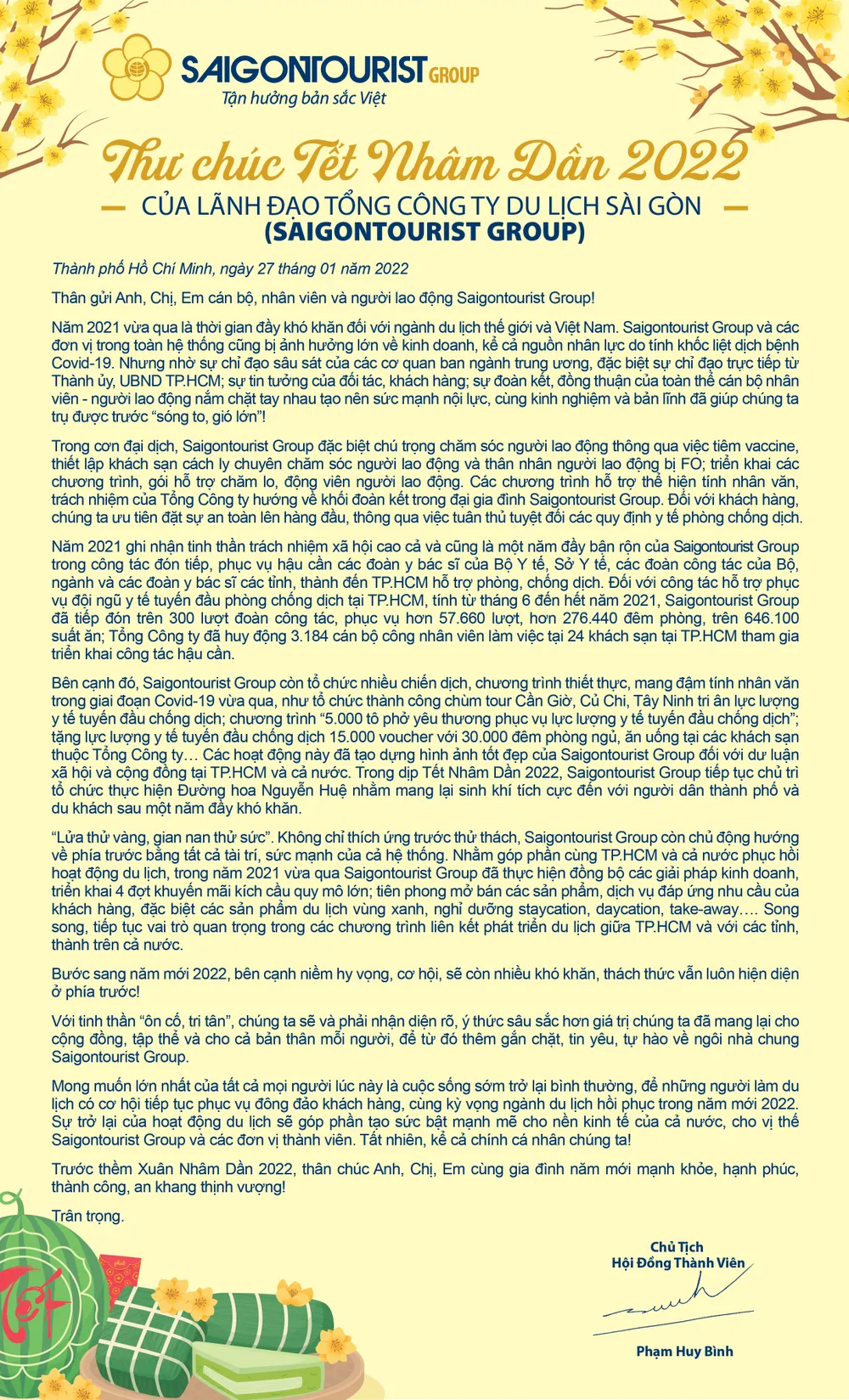 Thư chúc Tết của Ban lãnh đạo Saigontourist Group là thông lệ hằng năm, mục đích tri ân tập thể cán bộ, nhân viên và người lao động đã nỗ lực sau một năm và lan tỏa thông điệp tốt đẹp trong năm mới. Thư chúc Tết 2022 đã mang lại giá trị tinh thần to lớn đối với đại gia đình Saigontourist Group, làm nức lòng cả tập thể Saigontourist Group trước thềm xuân mới.