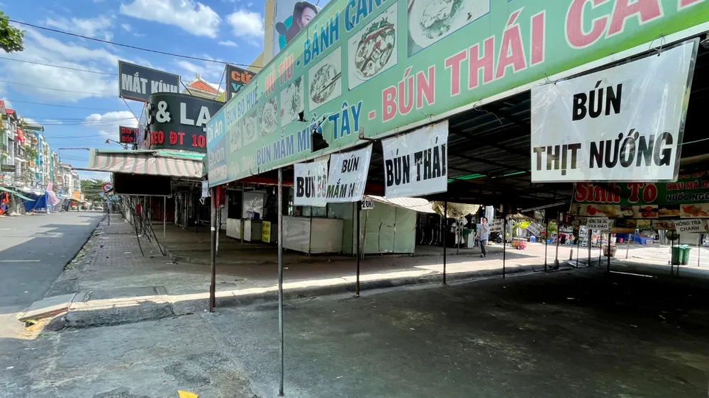 Trong khi đó, các hàng quán đều đã đóng cửa, thông báo tạm nghỉ do ảnh hưởng của dịch Covid-19. Khu vực chợ Hạnh Thông Tây ngày thường khá đông đúc nhưng trong ngày đầu giãn cách cũng rất thưa vắng.