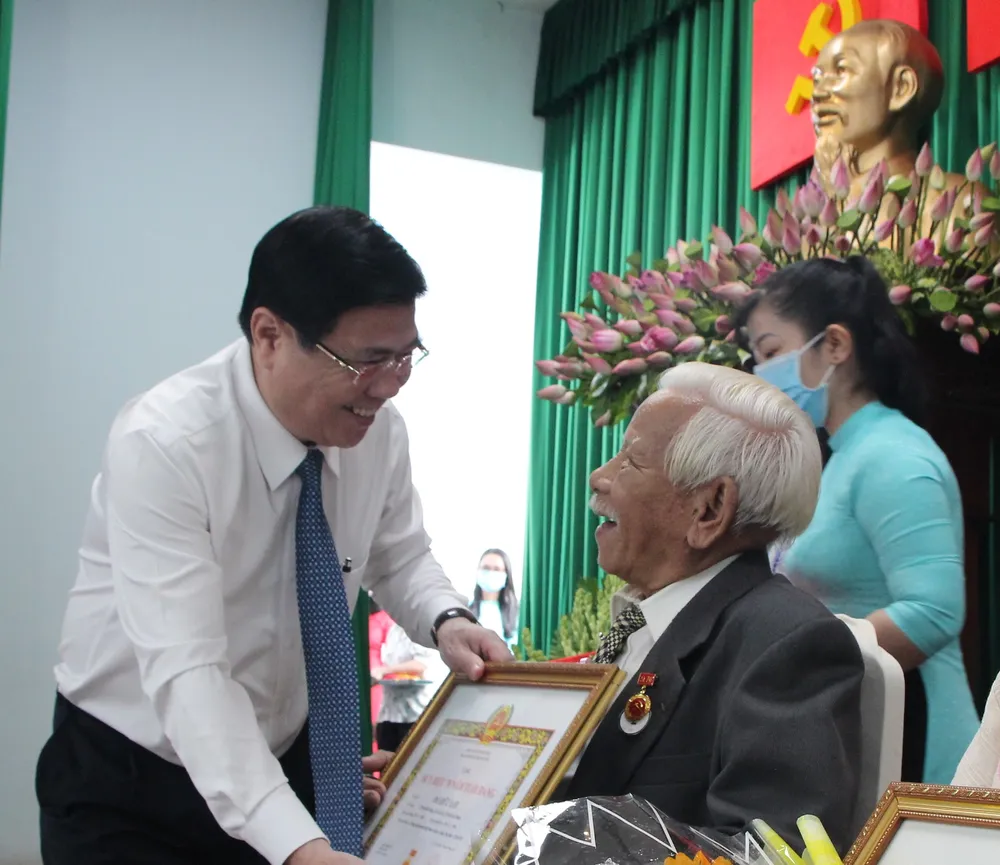 Chủ tịch UBND TPHCM Nguyễn Thành Phong cùng Bí thư Quận ủy quận 9 Lâm Đình Thắng tại lễ trao tặng Huy hiệu 70 năm tuổi Đảng tại nhà riêng đồng chí Thái Minh Xuyến. Ảnh: MAI HOA