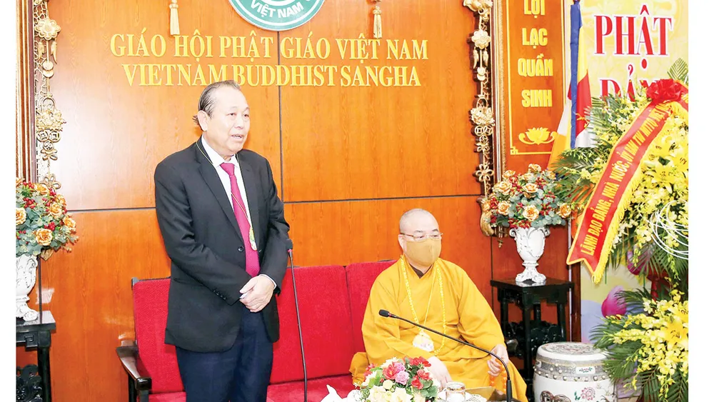 Phó Thủ tướng Thường trực Trương Hòa Bình chúc mừng Trung ương Giáo hội Phật giáo Việt Nam nhân Đại lễ Phật đản. Ảnh: TTXVN