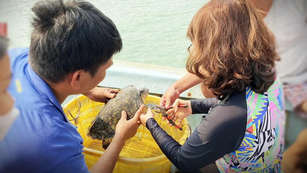 Chuyên gia gắn thiết bị theo dõi sức khỏe, định vị vào chân chú rùa biển được giải cứu vì mắc lưới ngư dân trước khi đem thả trở lại biển