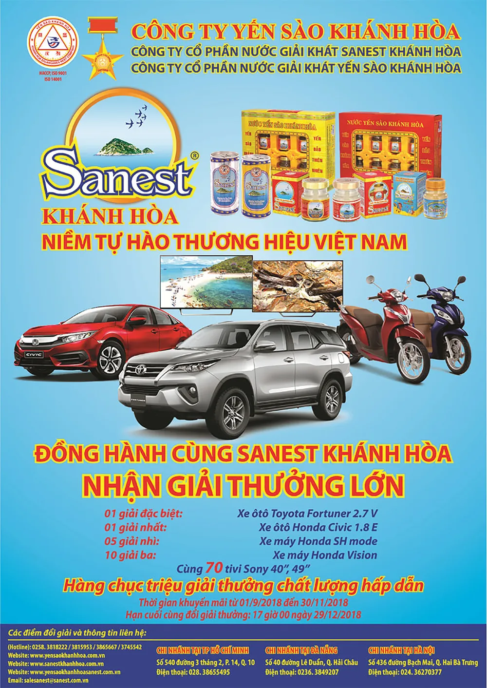 Danh sách địa điểm đổi giải (xem chi tiết tại www.yensaokhanhhoa.com.vn). Để biết thêm chi tiết xin vui lòng liên hệ (Hotline): Trung tâm Dịch vụ Khách hàng: 0258.3818222; Công ty Yến sào Khánh Hòa: 0258.3815953; Công ty Cổ phần Nước giải khát Sanest Khánh Hòa: 0258.3865667; Công ty Cổ phần Nước giải khát Yến sào Khánh Hòa: 0258.3745601. Email: salesanest@sanest.com.vn.
