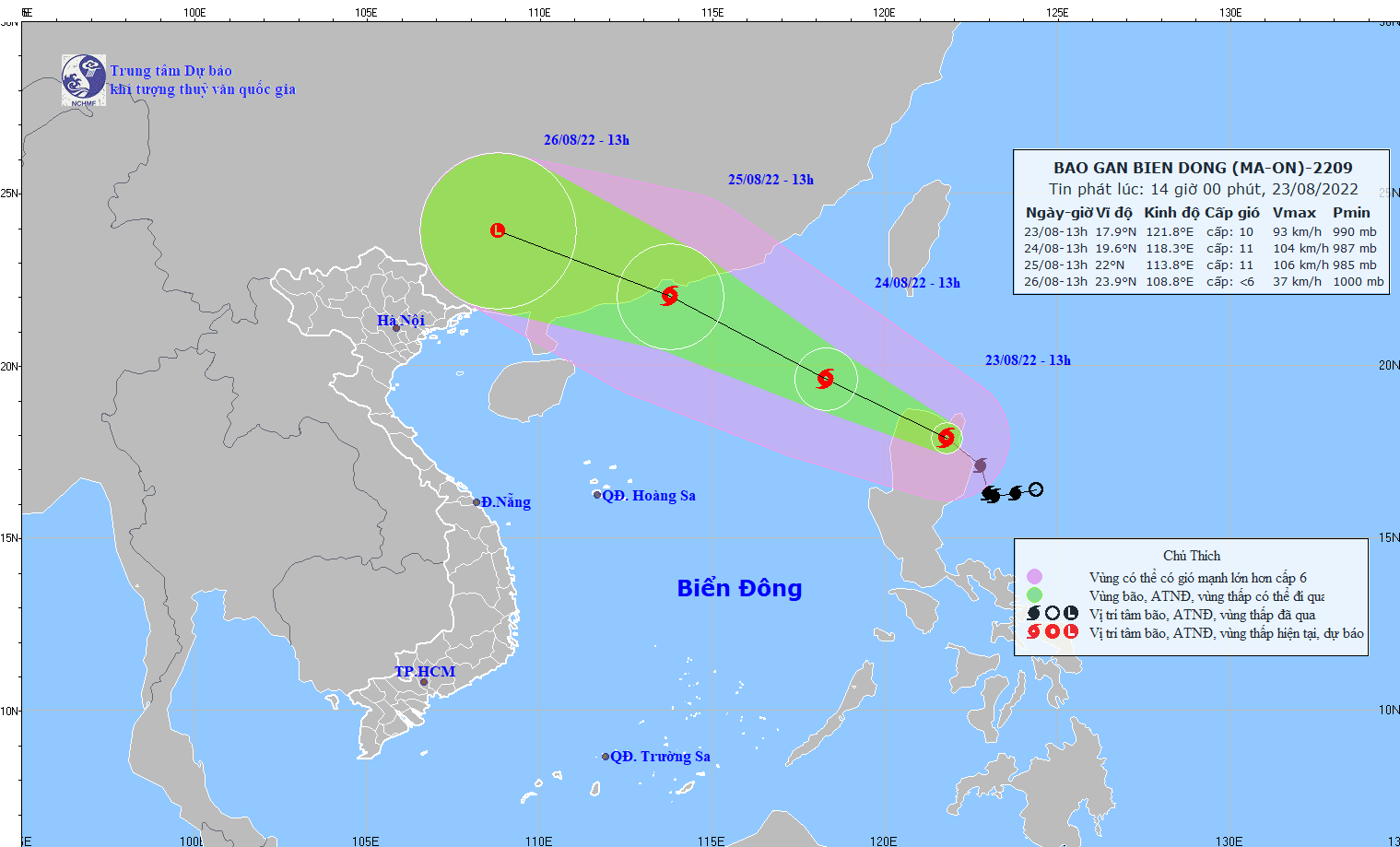 Dự báo khoảng đêm nay (23-8), bão Ma-on sẽ vượt qua phía Bắc đảo Luzon, đi vào khu vực phía Bắc của Biển Đông và sẽ trở thành cơn bão số 3 trong mùa bão lũ năm nay.