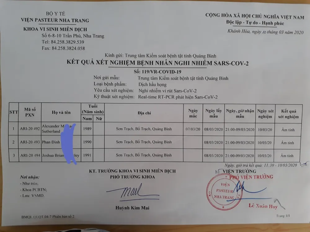 Theo đó, ngày 10-3, Khoa Vi sinh miễn dịch viện Pasteur Nha Trang đã gửi trả kết quả xét nghiệm âm tính cho tỉnh Quảng Bình, đối với chuyên gia hang động J.B.B.