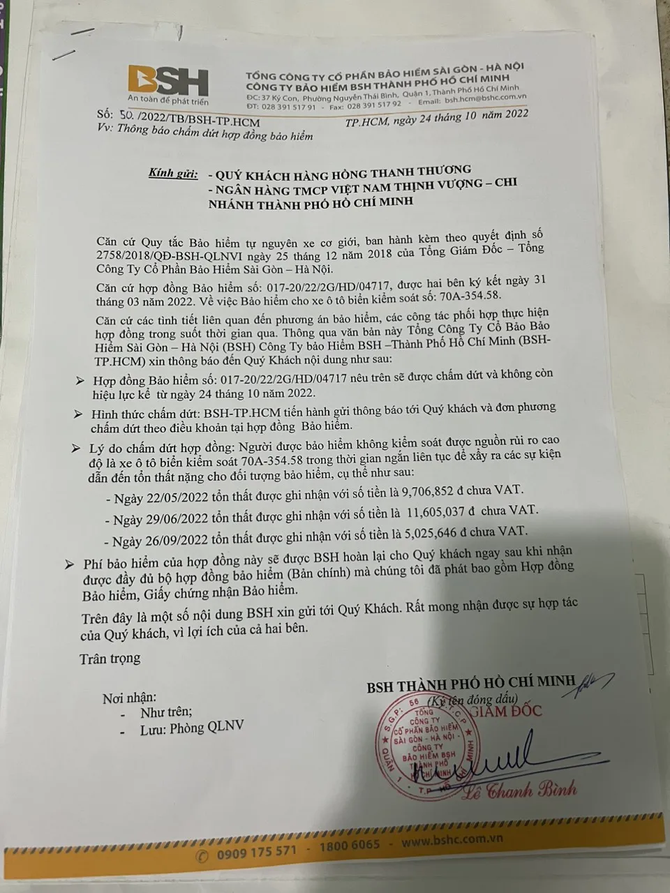 Cụ thể, ngày 24-10-2022, Công ty Bảo hiểm BSH gởi văn bản số 50/2022/TB/BSH-TPHCM về việc: Thông báo chấm dứt hợp đồng bảo hiểm cho khách hàng Hồng Thanh Thương (ở Tây Ninh) với lý do “Người được bảo hiểm không kiểm soát được nguồn rủi ro cao độ là xe ô tô trong thời gian ngắn liên tục để xảy ra các sự kiện dẫn đến tổn thất nặng cho đối tượng bảo hiểm, như sau: Ngày 22-5 tổn thất được ghi nhận với số tiền 9,7 triệu đồng; ngày 29-6 tổn thất 11,6 triệu đồng và ngày 26-9 tổn thất 5 triệu đồng”.