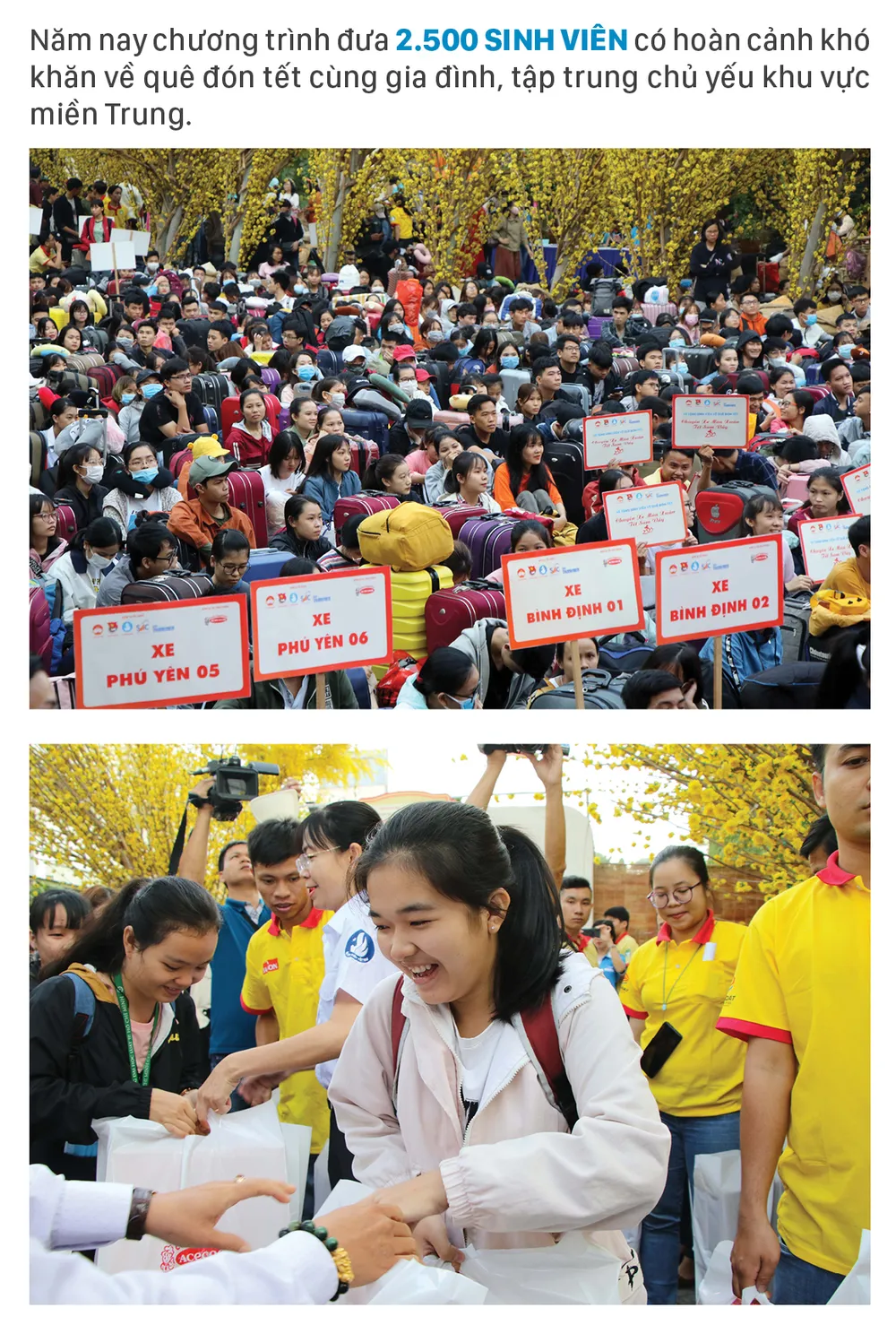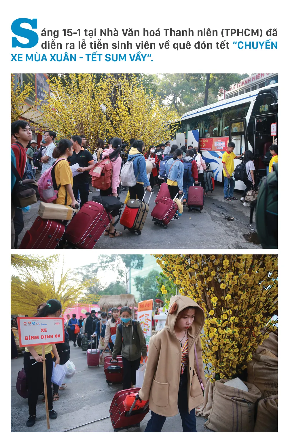 Sáng 15-1 tại Nhà Văn hoá Thanh niên (TPHCM) đã diễn ra lễ tiễn sinh viên về quê đón tết “Chuyến xe mùa xuân - Tết sum vầy”. Năm nay, chương trình đưa 2.500 sinh viên có hoàn cảnh khó khăn về quê đón tết.