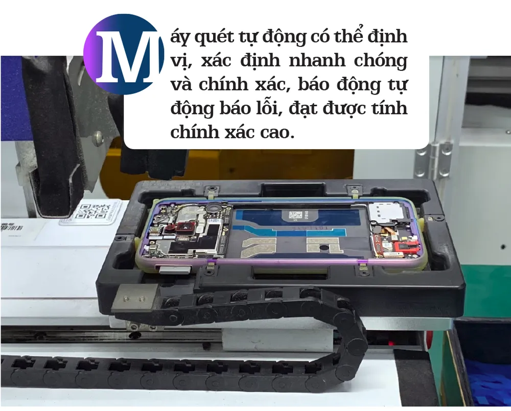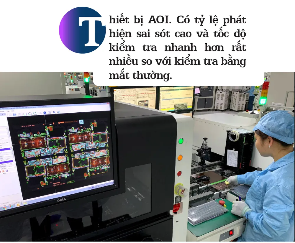 Thiết bị sẽ tự động kiểm tra độ chắc chắn và chính xác của vị trí hàn, chất lượng hàn bo mạch qua mỗi công đoạn lắp ghép. Việc sử dụng máy này giúp giảm tỷ lệ sai sót do kiểm tra bằng mắt thường của nhân công.