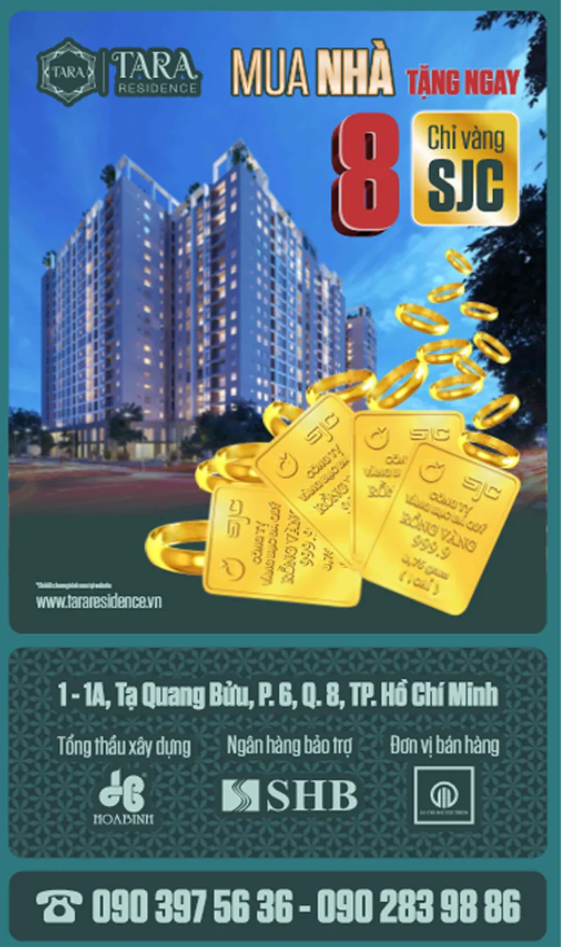 Không chỉ có cơ hội nhận xế đẹp, khi đặt mua căn hộ tại Tara Residence, khách hàng còn được nhận ngay 8 chỉ vàng SJC. Đối với 1 dự án thuộc phân khúc vừa túi tiền, có thể nói, đây là chương trình khuyến mãi “siêu khủng”, thể hiện những mức độ “chịu chơi” của chủ đầu tư.