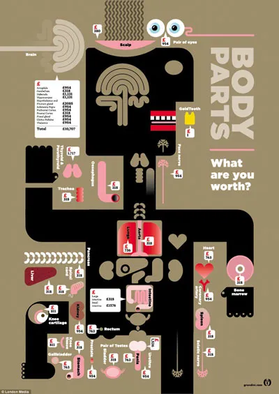(SGGPO).- Cuộc thi đồ họa thông tin (infographic) vừa kết thúc ở Anh với giải cao nhất thuộc về bản infographic cho thấy giá trị thực tế của từng bộ phận trên cơ thể con người, dựa theo tính toán bởi các nhà nghiên cứu của ngành công nghiệp phục hồi các mô con người trong thời điểm hiện tại.