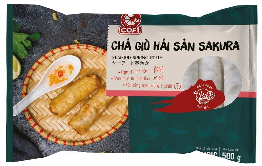 Sản phẩm Chả giò hải sản SAKURA mang bên trong phần nhân hải sản (cá, tôm). Sản phẩm được cải tiến cách gói bánh tráng giúp vỏ ngoài chả giò giòn và giữ được lâu. Phần nhân cuốn đầy hải sản được cấp đông theo công nghệ hiện đại nhằm giữ được nguyên độ tươi ngon của hải sản giúp người tiêu dùng cảm nhận được đầy đủ hương vị thơm ngon – độ ngọt của hải sản tươi khi cắn đôi cuốn chả giò đã được chiên giòn rụm.