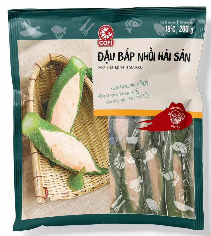 Sản phẩm Đậu bắp nhồi hải sản là sản phẩm tiên phong được làm theo kiểu công nghiệp cho các kênh ăn vặt (xiên que) đồng thời đa dạng hóa sự lựa chọn của khách hàng là các bếp ăn công nghiệp, các bàn tiệc.. thích hợp cho các tiệc buffet, làm món khai vị (tiệc), dùng chung với lẩu thái - lẩu mắm.. Sở hữu vùng nguyên liệu rộng lớn, đậu bắp giống Nhật có màu xanh đậm, thoạt nhìn trông như trái non, trồng theo quy trình của Nhật Bản, có vị ngọt, giòn, mang lại cảm giác mềm mịn, tươi ngon ngay từ nhát cắn đầu tiên. Nhân hải sản được kế thừa từ công thức cá viên Sakura nên đảm bảo được hương thơm và độ ngọt tự nhiên cho từng sản phẩm.