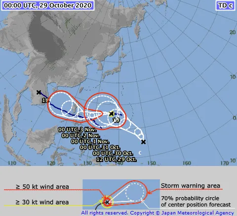 Theo Cơ quan Dự báo khí tượng Nhật Bản, sáng 29-10, một vùng áp thấp nhiệt đới ở phía Đông Philippines đã mạnh lên thành cơn bão có tên quốc tế là Goni.