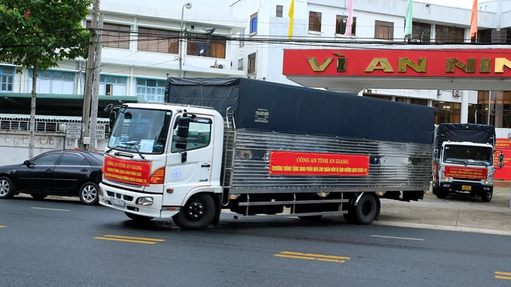 Đợt này, Công an tỉnh An Giang tặng 3.000 phần quà, mỗi phần quà trị giá 500.000 đồng, gồm 10kg gạo, rau củ quả và các nhu yếu phẩm thiết yếu khác.
