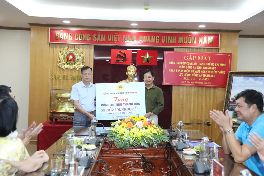 Cụ thể, Công an TPHCM phối hợp với các nhà tài trợ đến thăm hỏi, động viên, trao tặng 5 căn nhà tình nghĩa cho cán bộ chiến sĩ và người dân có hoàn cảnh đặc biệt khó khăn; tặng 300 phần quà, học bổng cho con của cán bộ chiến sĩ có kết quả học tập tốt, 3 tivi, thiết bị y tế cho Công an huyện: Triệu Sơn, Quan Hóa, Mường Lát, Quan Sơn, Thọ Xuân, Công an tỉnh Thanh Hóa, Thị xã Bỉm Sơn.