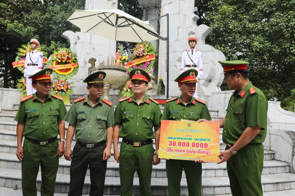 Tại các điểm đến, đoàn công tác Công an TPHCM đã trao tặng các phần quà với kinh phí hơn 740 triệu đồng, hỗ trợ nâng cấp sửa chữa trụ sở Công an Tỉnh Quảng trị, Công an huyện Gio Linh - Quảng Trị, Công an tỉnh Hà Tĩnh, Công an huyện Đức Thọ. Trong đó, hỗ trợ 200 triệu xây dựng trụ sở Công an xã An Dũng - huyện Đức Thọ và trao 200 phần quà cho nạn nhân chất độc màu da cam huyện Đức Thọ, đóng góp kinh phí duy tu sửa chữa tại các khu Di tích Thành cổ Quảng Trị, Nghĩa trang Liệt sĩ Quốc gia đường 9, Nghĩa trang Liệt sĩ Quốc gia Trường Sơn, Ban Quản lý khu di tích lịch sử Đôi bờ Hiền Lương, Ban Quản lý khu di tích lịch sử Ngã ba Đồng Lộc, tặng và trồng cây lưu niệm tại khu mộ Đại tướng Võ Nguyên Giáp và Khu di tích lịch sử Ngã ba Đồng Lộc.