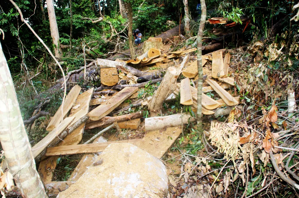 Tại hiện trường, có rất nhiều cây gỗ đường kính từ 40cm đến 1,05m bị lâm tặc cưa hạ, gốc nằm trơ khắp rừng; nhiều cây gỗ rừng cổ thụ đã bị cưa, xẻ ra để lấy gỗ cội, ván, rễ nằm la liệt giữa rừng; số khác vẫn chưa được cưa xẻ, bị lâm tặc cắt thành từng khúc lớn; dọc con đường do lâm tặc tự mở để làm bãi tập kết gỗ lớn nhỏ…